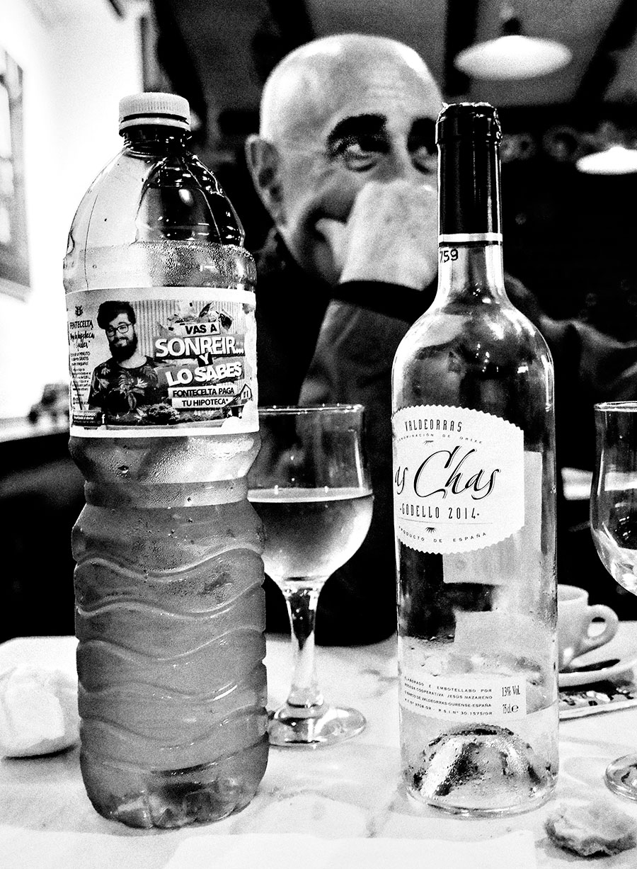 Haber hay bosques y sotobosques. En los primeros los hay de varios tipos y de eso Wenceslao Fernández Flórez lo sabía muy bien. En este caso Paco Pestana, pensativo, se ubica detrás de un bosque inanimado de botellas con un sotobosque formado por copas, tazas y otros elementos. La foto, en el Mesón do Forno (Lugo), está hecha tras los postres de una comida a la que nos acompañó el fotógrafo también lucense Carlos Valcárcel.