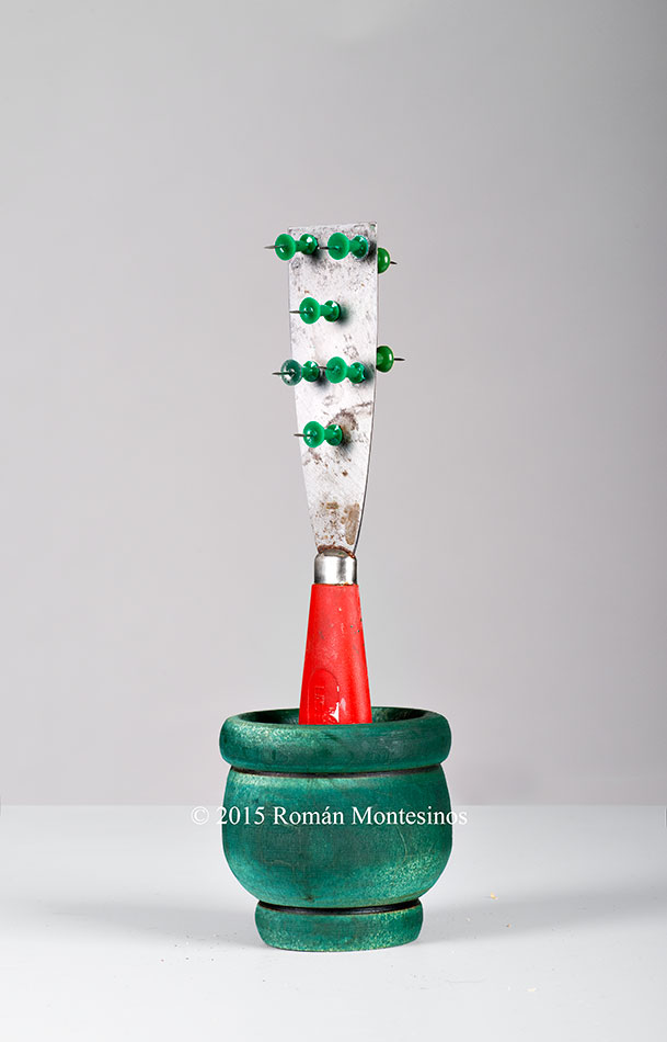 El pegado de las chinchetas en la espátula tuvo «su cosa» ya que su superficie era convexa. Para poder pegarlas, tuve primero que lijar la base y aplanarla. Tampoco tenía un recipiente adecuado para poner el «cactus», pero un mortero de ajo y perejil pintado rápidamente valió para tal efecto.
