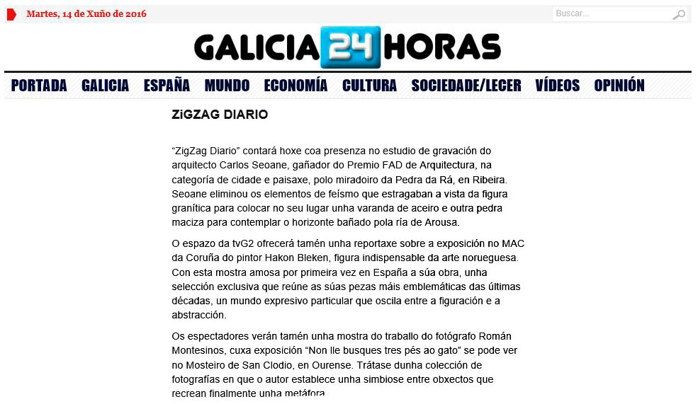 El espacio cultural ZigZag Diario de la TVG2 (Televisión de Galicia), dirigido y presentado por Pilar Rego, emitirá esta tarde del martes 14 de julio, a partir de las 21 horas, un pequeño reportaje sobre la exposición «No le busques los tres pies al gato» que exhibo en las paredes del Hotel Monumento Monasterio de San Clodio en Leiro (Ourense), regentado por la cadena hotelera Eurostars Hotels.