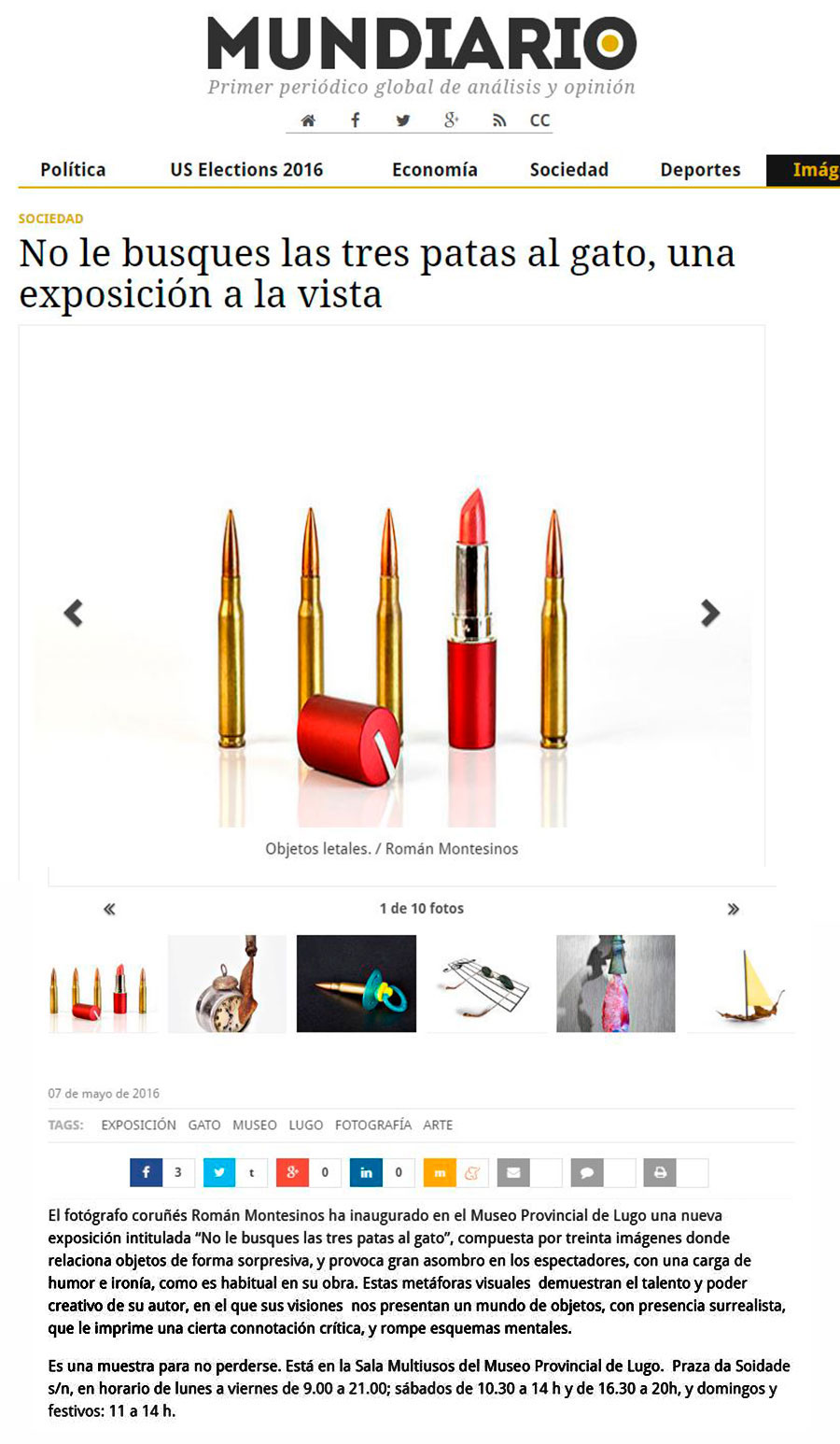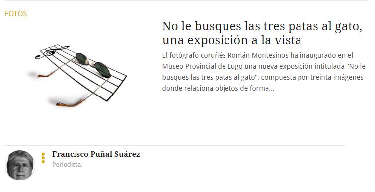 Ayer fue la inauguración de «No le busques los tres pies al gato» en el Museo Provincial de Lugo. Puntual como un clavo se acercó al museo María L. Viñas, redactora del Progreso de Lugo con el fin de visionar las fotografías de la muestra y hacerme unas preguntas para un artículo de prensa. Visitó la sala y contempló una a una todas las fotos expuestas, interesándose por detalles de las mismas, a la par que me hacía otro tipo de preguntas. De mis relaciones con la prensa sé que el proceder de María no es muy habitual, por lo que uno queda realmente agradecido si observa que hay interés por parte del/la periodista. Fruto de su visita hizo el siguiente artículo publicado hoy 6 de mayo de 2016. Gracias María.