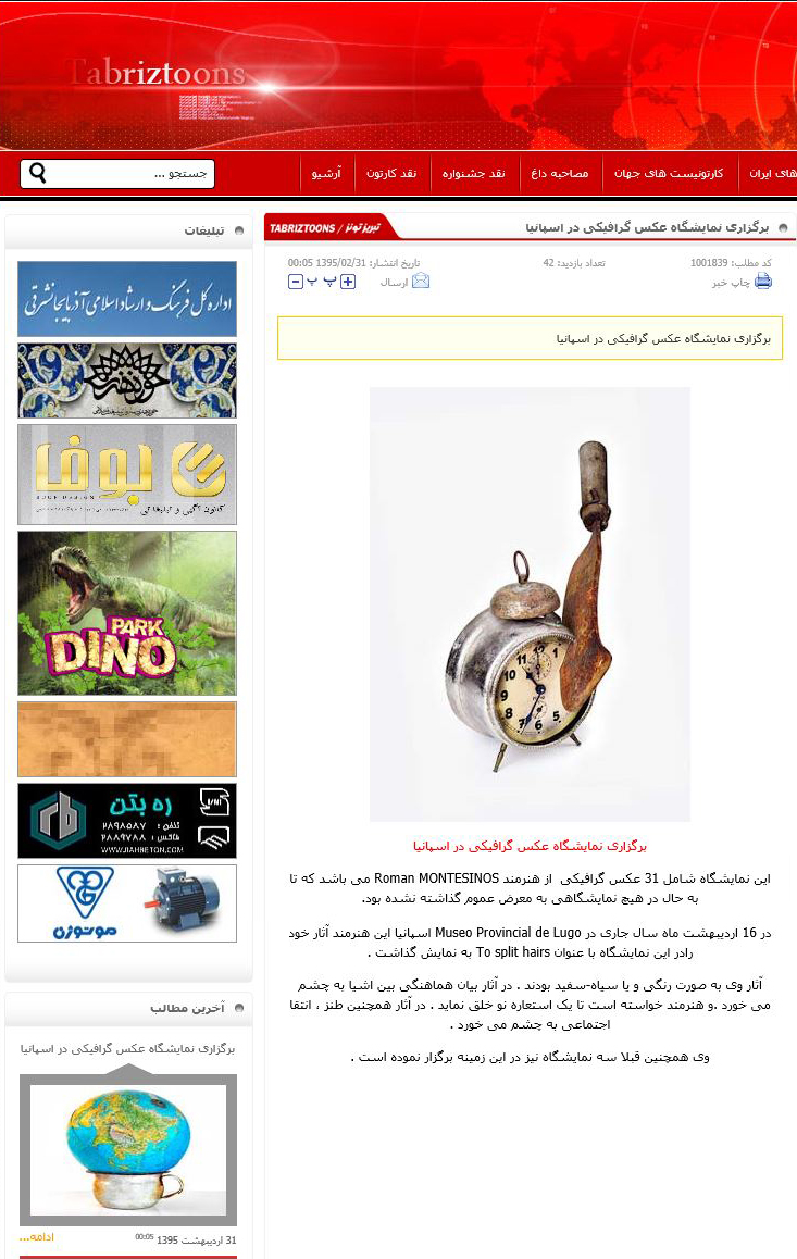 Hoy a la mañana, con la neblina ocular propia de la hora temprana, abrí una alerta y creí que mi vista no enfocaba bien. ¿Qué rayos era lo que estaba viendo?… una foto de mi expo en el Museo Provincial de Lugo y un texto ininteligible. Bien, pasándolo al inglés, averigué que es un blog dedicado al humor gráfico que se gestiona y edita desde Tabriz, en Irán, y que el idioma que estaba viendo era el persa. El blog se llama «Tabriztoons» y, la verdad, es que me han sorprendido. Gracias!