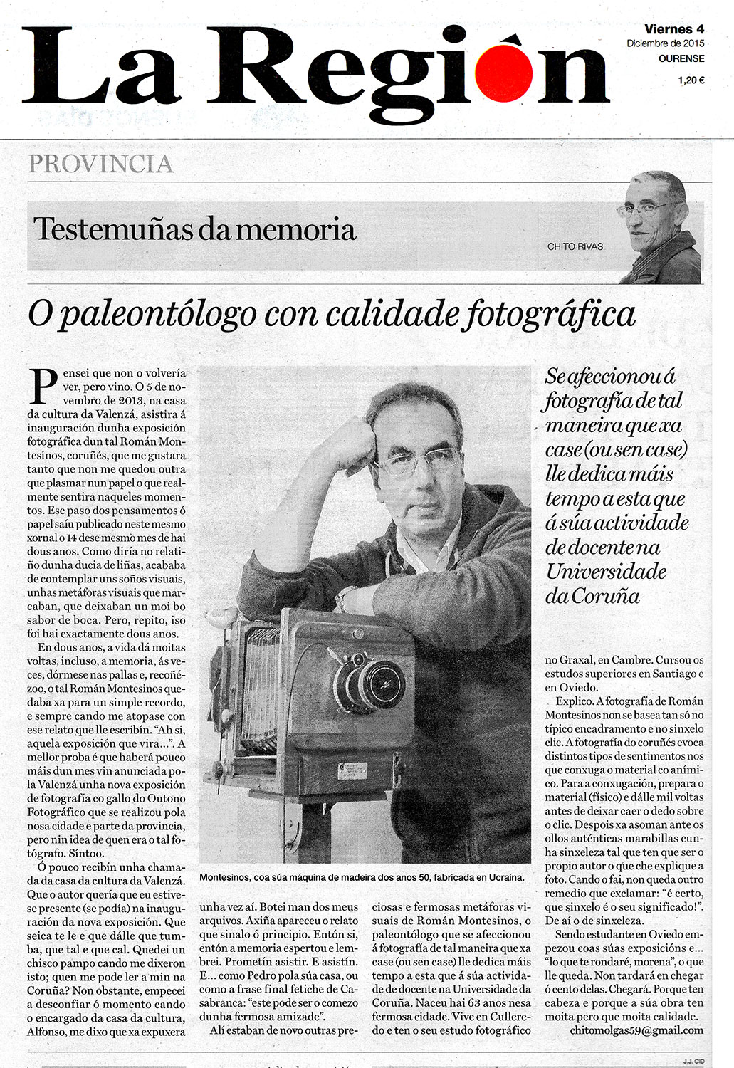 Hoy viernes ha salido publicado en el diario La Región de Ourense un artículo del entrañable periodista y crítico Chito Rivas. Versa sobre la exposición que he mantenido hasta hace muy pocos días en la Casa de A Cultura de A Valenzá (Barbadás, Ourense). Es muy de agradecer el cariño con que ha redactado sus líneas y que le agradezco profundamente desde aquí.