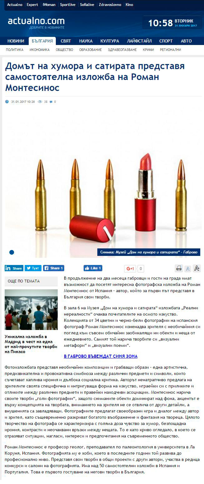 Noticia de la exposición en el museo «House of Humor and Satire» de Gabrovo en el medio de noticias «Actualno.com» de Bulgaria.