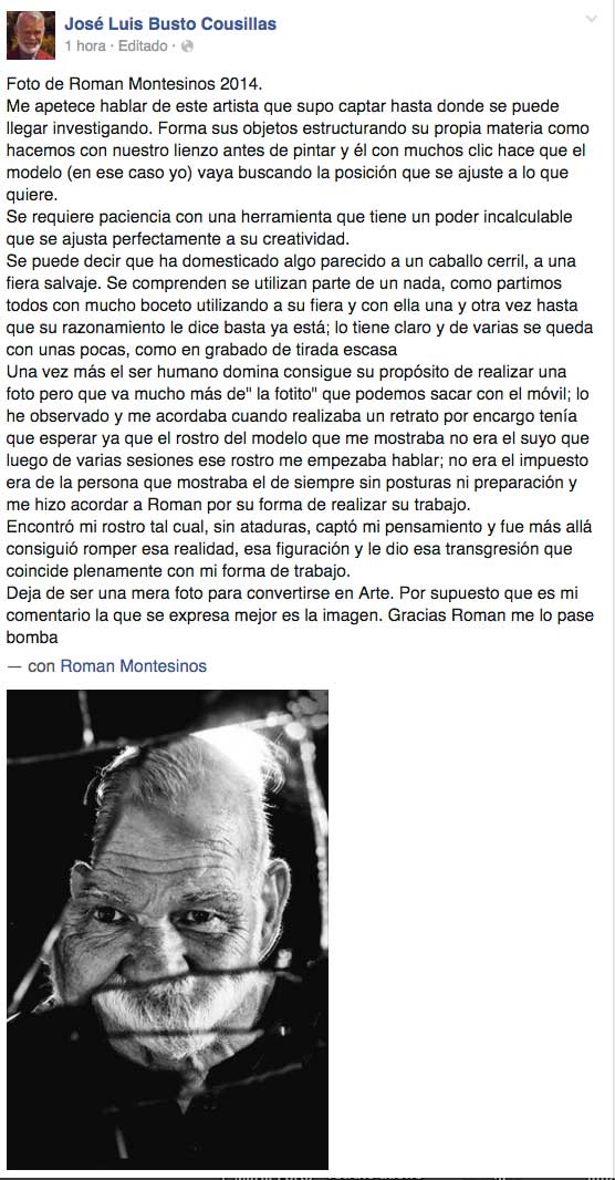Hace poco publiqué en este blog una entrada dedicada al pintor coruñés José Luis Busto Cousillas. En la sesión fotográfica que le hice no solo fue el retrato anteriormente publicado aquí, también experimenté -en primer lugar- una foto que reflejase su forma de expresar su arte. Descompuse su imagen tal que un artista como él mismo descompone la escena real o imaginaria que plasma en su obra. No pensaba subir el retrato hasta que él me hiciese un comentario sobre el mismo. No tardó y lo hizo en Facebook con un texto emocionante que reproduzco aquí.
