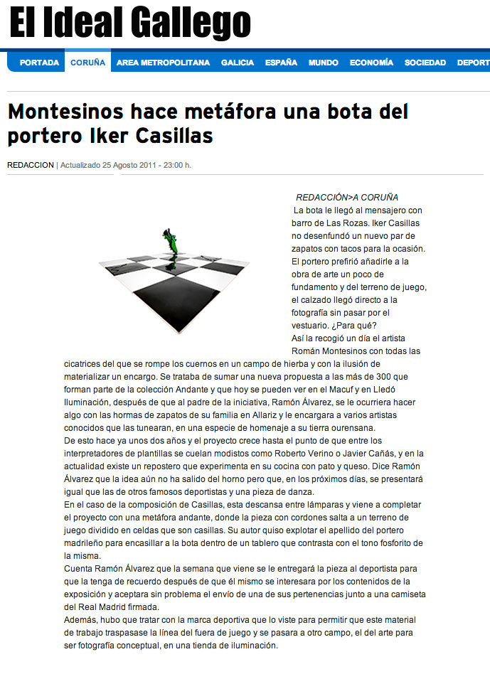 Anteayer tarde, 11 de septiembre, se inauguró la nueva exposición de Andante en la galería de arte Apo’strophe de Vigo. En ella se muestran más de un centenar de piezas de la totalidad de obras que componen la colección privada del arquitecto alaricano Ramón Álvarez. Mi contribución a la exposición de Andante queda materializada en un doble camino: uno físico, con el retrato que le hice en su día a Ramón Álvarez y, otro espiritual, a través del artículo de Marta García Márquez, (y la foto incluida en él) en El Ideal Gallego, que acompaña a la bota donada por Iker Casillas al proyecto.