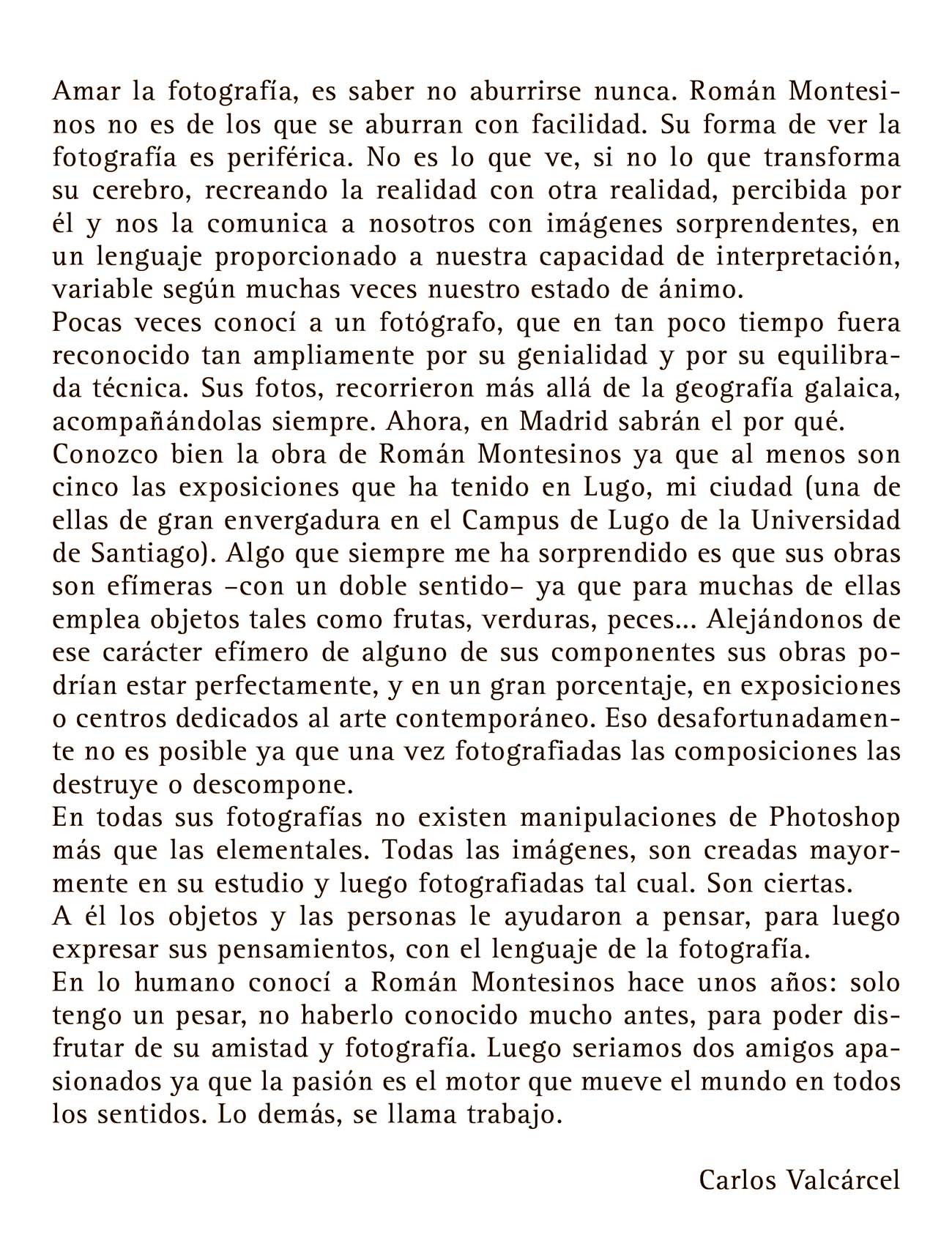 Carlos Valcárcel, maestro e insigne fotógrafo gallego, ha tenido la gentileza de prologar el catálogo de la exposición que se inaugura, el día 10 de septiembre, en Madrid en la Casa de Galicia. Ha sido para mi un honor que Carlos aceptase redactar la presentación de mi persona y mi trabajo con unas líneas tan entrañables. Desde la amistad te traslado mi gratitud y mi admiración Carlos. Gracias.
