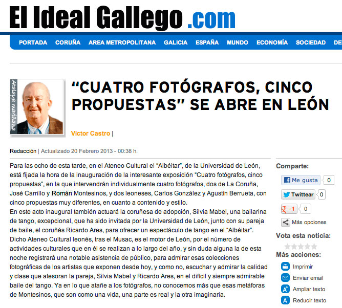 De la mano y pluma del periodista Víctor Castro de El Ideal Gallego en su columna de este diario coruñés. Víctor Castro relata en él el contenido de la exposición haciendo mención especial a la participación de Silvia Mabel y Ricardo Ares con una alusión a su actuación de tango. Víctor ha usado una frase al final del párrafo que me sensibilizó y que se refiere a la parte real e imaginaria de las metáforas visuales. Víctor, en nombre de todos te ofrezco nuestro agradecimiento.