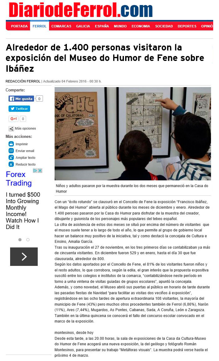 Ayer tarde día 4 inauguré una exposición titulada «Metáforas visuales» en el Museo del Humor de Fene. Esta entrada del blog recoge dos noticias de prensa, relacionadas con la exposición, publicadas por el Diario de Ferrol los días 4/2/2016 y 5/2/2916.