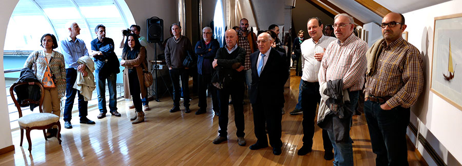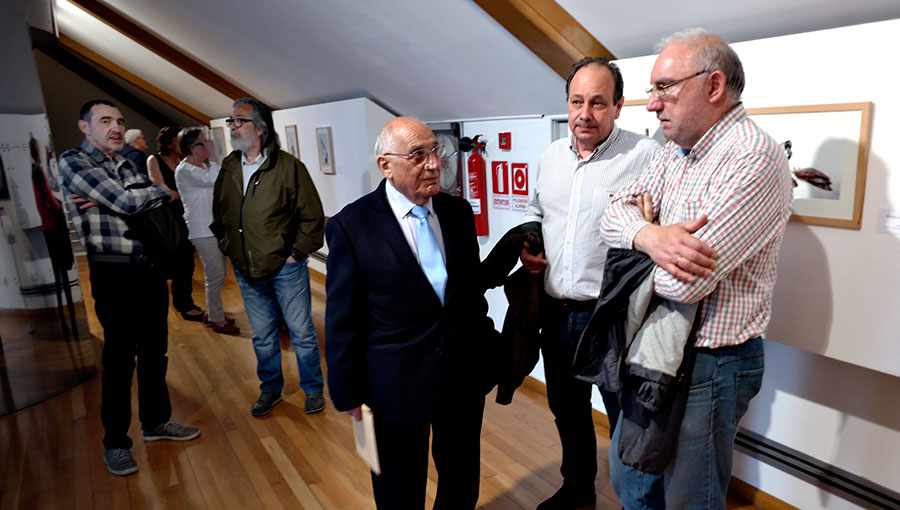 El mestro Carlos Valcárcel también asistió a la inauuración. En el fondo los fotógrafos Monch Rama, Eduardo Ochoa y José Manuel Rodríguez. Tras Carlos Valcárcel está Carmen Villar, pintora gijonesa,