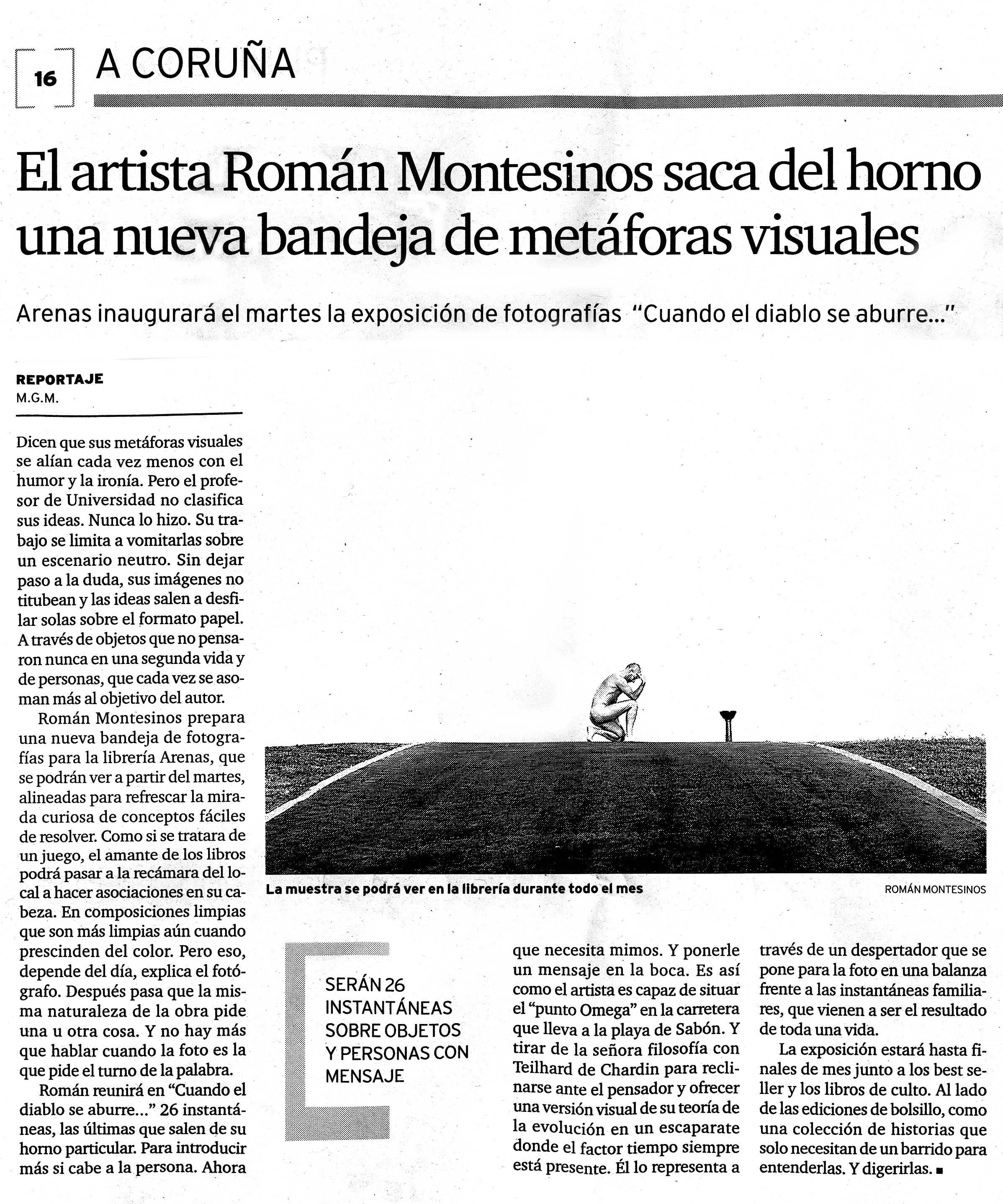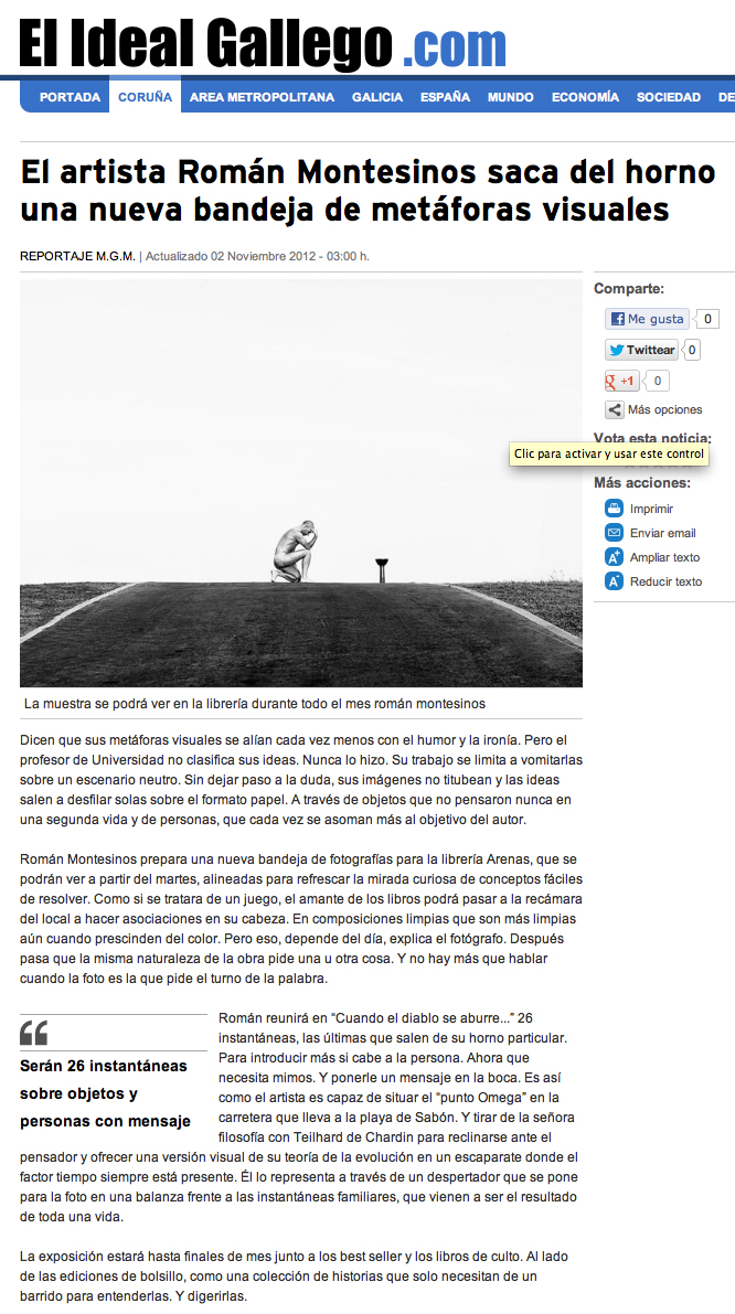 Hoy ha salido publicado en El Ideal Gallego y de la mano de la excelente periodista Marta García Márquez un artículo sobre la exposición en la Librería Arenas (La Coruña). En el artículo Marta habla del contenido de la exposición con el peculiar, bonito y estilizado estilo que la caracteriza. Muchas gracias Marta!!!.