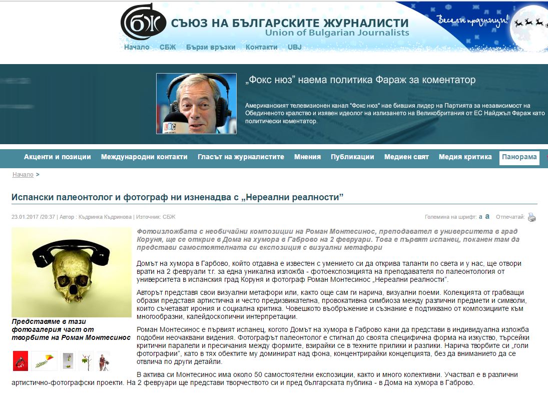 Nunca había pensado que mi actividad fotográfica se publicase en cirílico, pero siempre hay esa primera vez de las cosas. Hoy ha salido publicada en la WEB de la Unión de Periodistas Búlgaros la noticia de mi exposición en el Museo Casa del Humor y la Sátira de Gabrovo. La exposición se inaugura el próximo 2 de febrero.