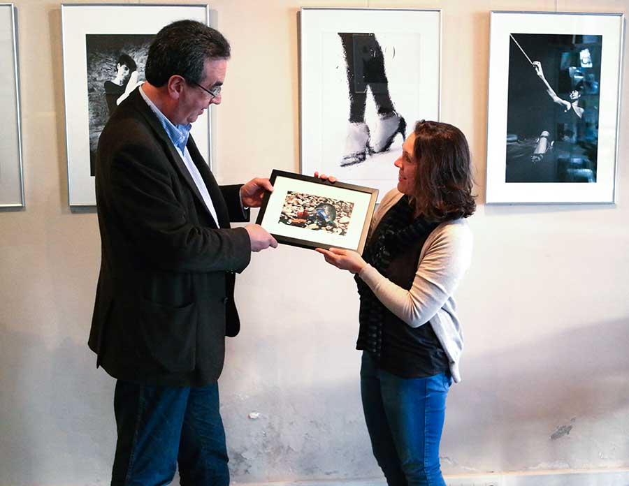 Hoy con la comisaria de la exposición Juana Prieto Luna haciéndole entrega de la foto titulada «Tiempos actuales – Mensaje en una botella». Al fondo la exposición «Mujer» que mantengo activa en el Ciber de Mao a la que le quedan 8 días para acabar su tiempo.
