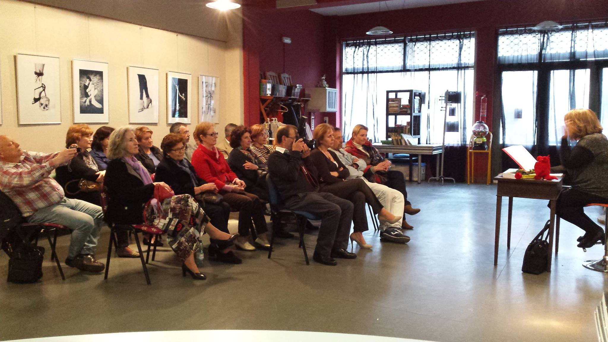 Amelia de Querol ofrece sus poemas en el Ciber de Mao. Al fondo las fotografías de la colección «Mujer». Foto © 2015 Juana Prieto Luna.