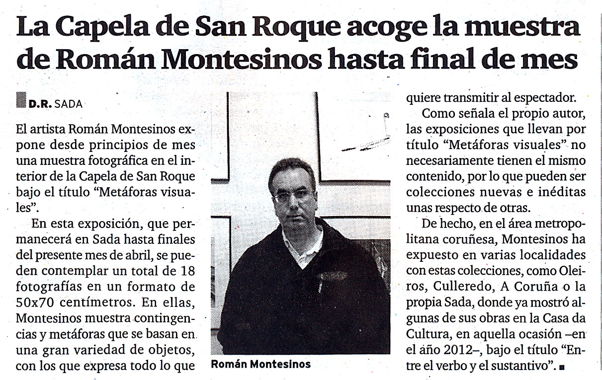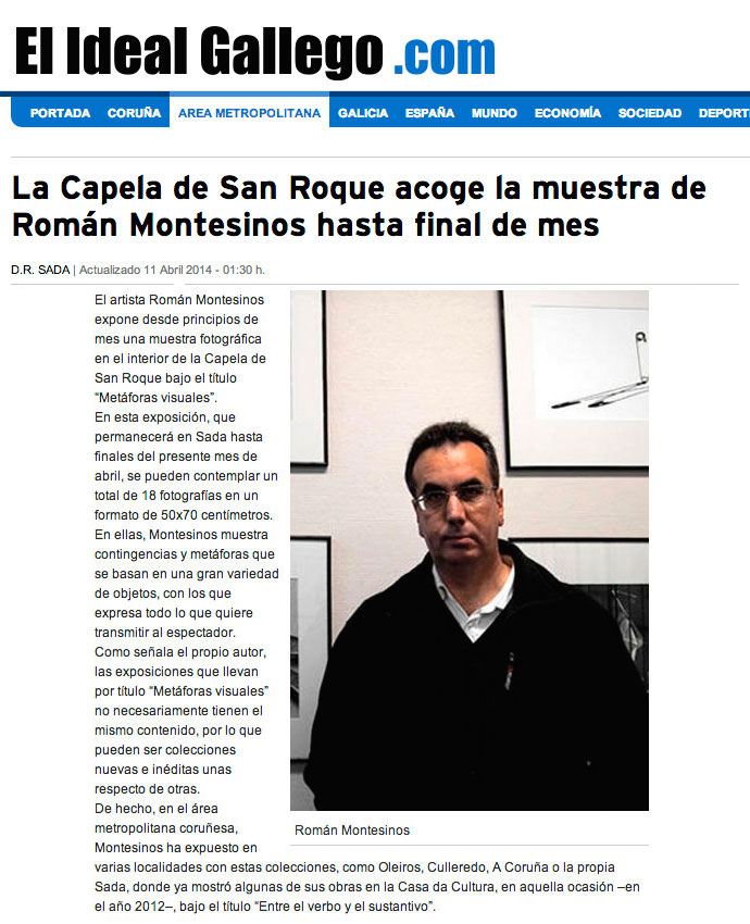 Hoy 11 de abril el diario El Ideal Gallego recoge la noticia de la exposición que actualmente tengo colgada en Sada (La Coruña) en el singular marco de la Capilla de San Roque. Esta exposición titulada «Metáforas visuales» muestra 23 fotografías en las que intervienen tanto personas como objetos en contingencia con otros elementos. Permanecerá activa hasta final de mes. El Ideal Gallego es un periódico que muestra una especial sensibilidad a los diferentes actos y encuentros culturales y sociales que se desarrollan en la comarca coruñesa.