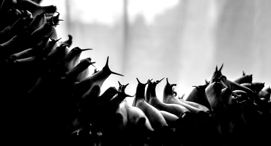 Con sus cuernecillos al sol, y vueltos hacia él, parecen caracoles o babosas pero son otra cosa bastante diferente. Los sucedáneos de cuernos son, en realidad, espinas de un cactus: Euphorbia lactea, un cactus realmente curioso por su forma y que es muy habitual en las floristerías y afines. No, no da leche ni tampoco lana.