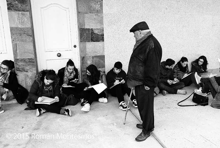 Un grupo de alumnos se afana en una tarea que se le encomendó al final de una salida de prácticas de campo. Pausadamente un espectador del lugar recorre las diferentes posiciones del largo número de alumnos que, literalmente, se desparraman por un alpendre que les protege de la lluvia (unos 50 alumnos). Tranquilo, sin decir ni una palabra, el hombre con su bastón se va fijando detenidamente en lo están haciendo e intenta comprender lo que está ocurriendo en su tranquilo entorno. «Estas cosas, hace años, no sucedían».