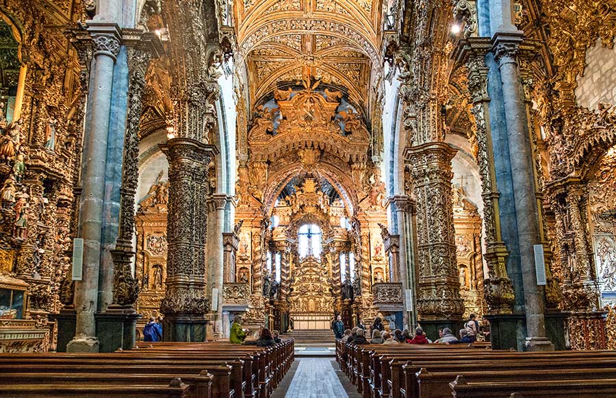 La iglesia de San Francisco es uno de los monumentos más importantes de Oporto. De origen románico fue reconstruida, tras un incendio, con arquitectura gótica. Durante los siglos XVII y XVIII se ornó interiormente por muchos retablos barrocos recubiertos de polvo de oro. Es bonita y cuando uno entra tiene la sensación de penetrar en una inmensa cámara de un tesoro. Particularmente, pese a reconocer de que se trata de una joya, este estilo barroco extremadamente recargado no es muy de mi gusto. Me agrada más el barroco más sencillo, tipo andaluz o siciliano, que el francamente ostentoso de esta iglesia. Dicen que se emplearon 300 kilos de polvo de oro para la ornamentación y tal es el punto que hace ya tiempo que no se oficia en esta iglesia en respeto a la pobreza que asoló Portugal hace años.