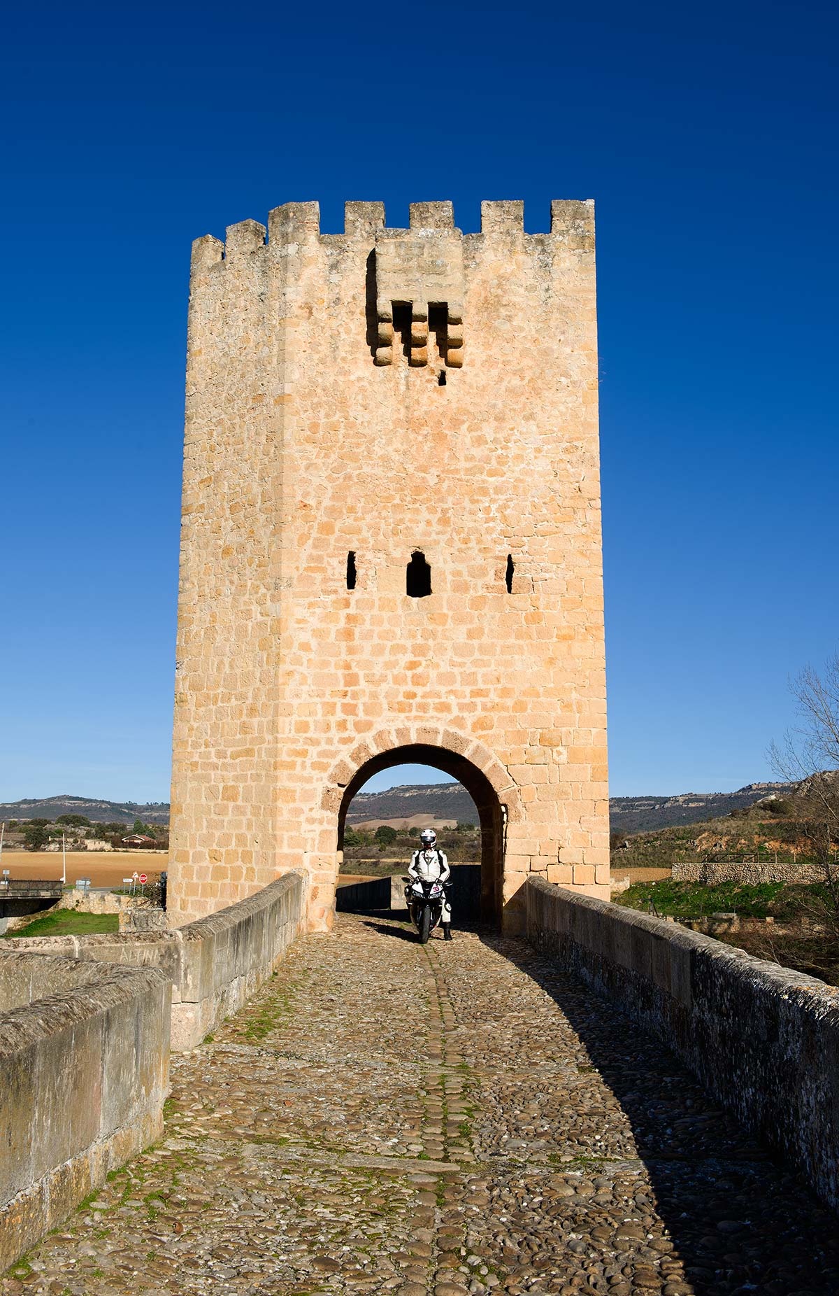 A Rober lo conocí en el bello puente medieval de Frías, sobre el Ebro. Mientras hacía unas fotos y mis perrillos estiraban un poco sus patas apareció con su moto en una cabecera del puente. Según lo vi se me ocurrió una foto… Hola, por favor, ¿puedes ponerte bajo el arco de la torre?… es para hacer una foto de «los nuevos caballeros» o «la nueva caballería»… Muy amablemente Rober montó sobre su moto dirigiéndose al sitio indicado y allí posó. Un saludo Rober y gracias. Un placer el haberte conocido!!!.