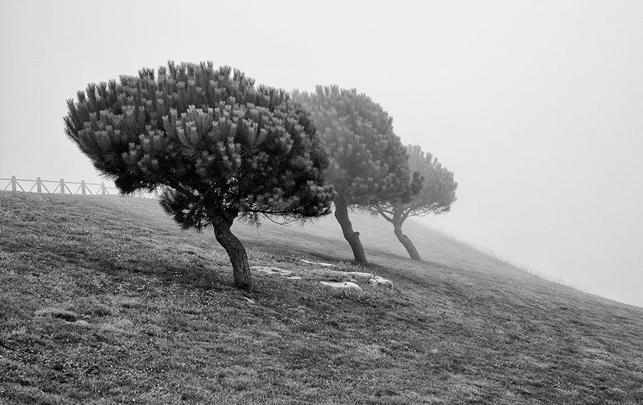 Siempre he pensado que el idioma de la isla de Albión existe para trabar la lengua a los devotos papistas. Pese a ello, la foto muestra «Three trees» o «Tres trees» que corresponden a tres arbolitos en el bello parque forestal de Monticaño en Pastoriza (Arteixo, La Coruña). El más que constante viento del noroeste les hace inclinarse en la ladera.