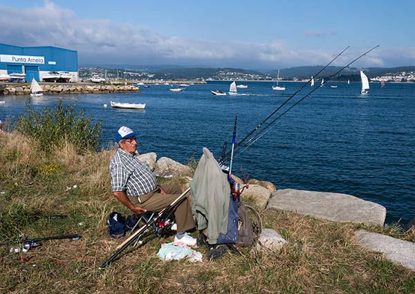 Es una buena filosofía para un deporte ya de por si reposado. Manos atrás y esperar a ver que el corcho se hunda o la caña vibre. La foto está hecha en Sada (La Coruña) al borde de su paseo marítimo.
