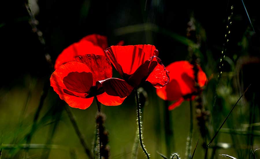 En esta época de finales de primavera los trigales se inundan de amapolas. Forman un fuerte contraste en el fondo verde del trigo sin agostar. Poco les queda pues son bastante efímeras y el paisaje se mudará a un único color dorado de las mieses listas para ser cosechadas.