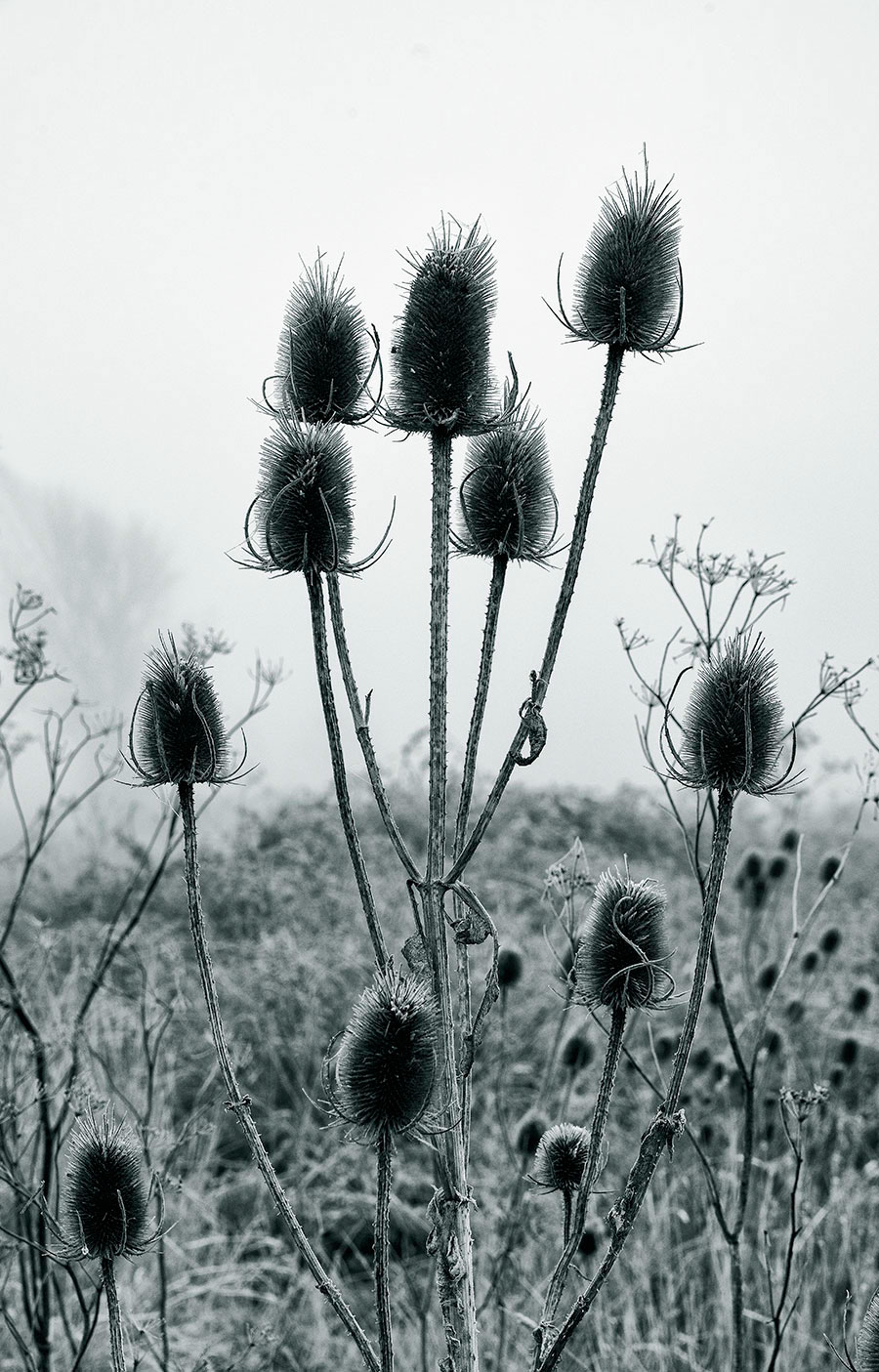 Como colofón a la serie de nieblas que vengo publicando en el blog no podía faltar una foto de unos cardos (borriqueros). Es una planta que me atrae. Parecen siempre «atormentados» en el sentido figurativo francés y se integran perfectamente en el paisaje. Desde los solitarios a los agrupados, verdes o secos, helados por la escarcha o no, siempre son fotogénicos. Un recuerdo para ellos.