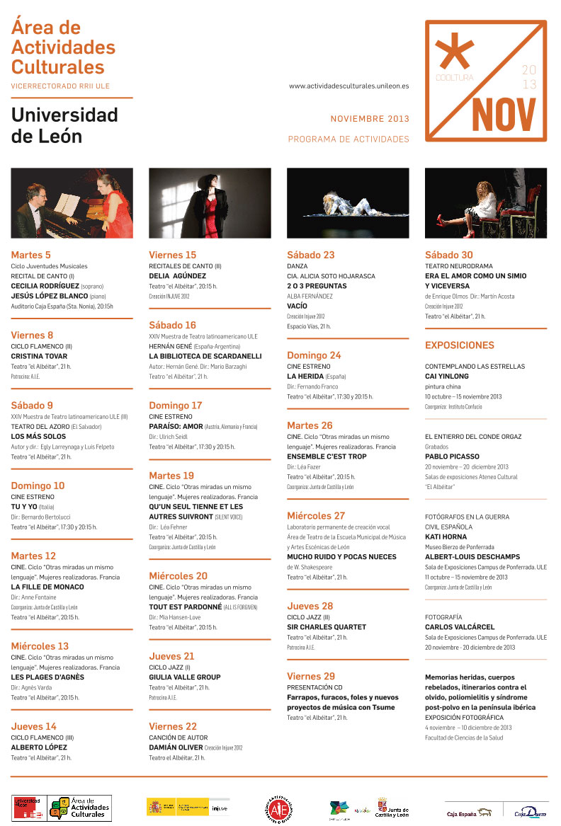 El Área de Actividades Culturales de la Universidad de León es -como ya he citado en varias ocasiones en este blog- una dependencia universitaria más que activa a la hora de realizar diferentes eventos culturales. En este caso reproduzco más abajo la oferta cultural para el mes de noviembre.