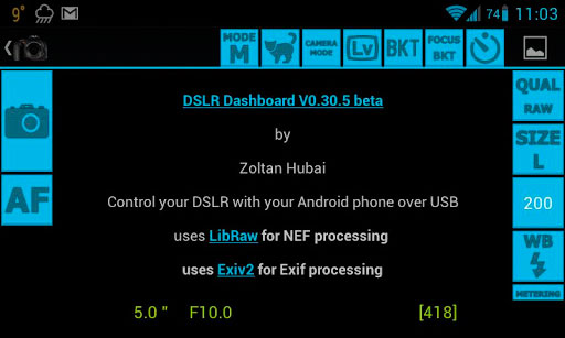«Hoy he instalado y probado una app para mi tablet Android. Se trata de la denominada DslrDashboard, (DSLR Dashboard) disponible en la Google Play, cuyo autor es Zoltan Hubai. Este programa viene a suplir, entre otras cosas, las carencias que tiene la app de Nikon para controlar la cámara vía la unidad WiFi WU 1b (o WU 1a).