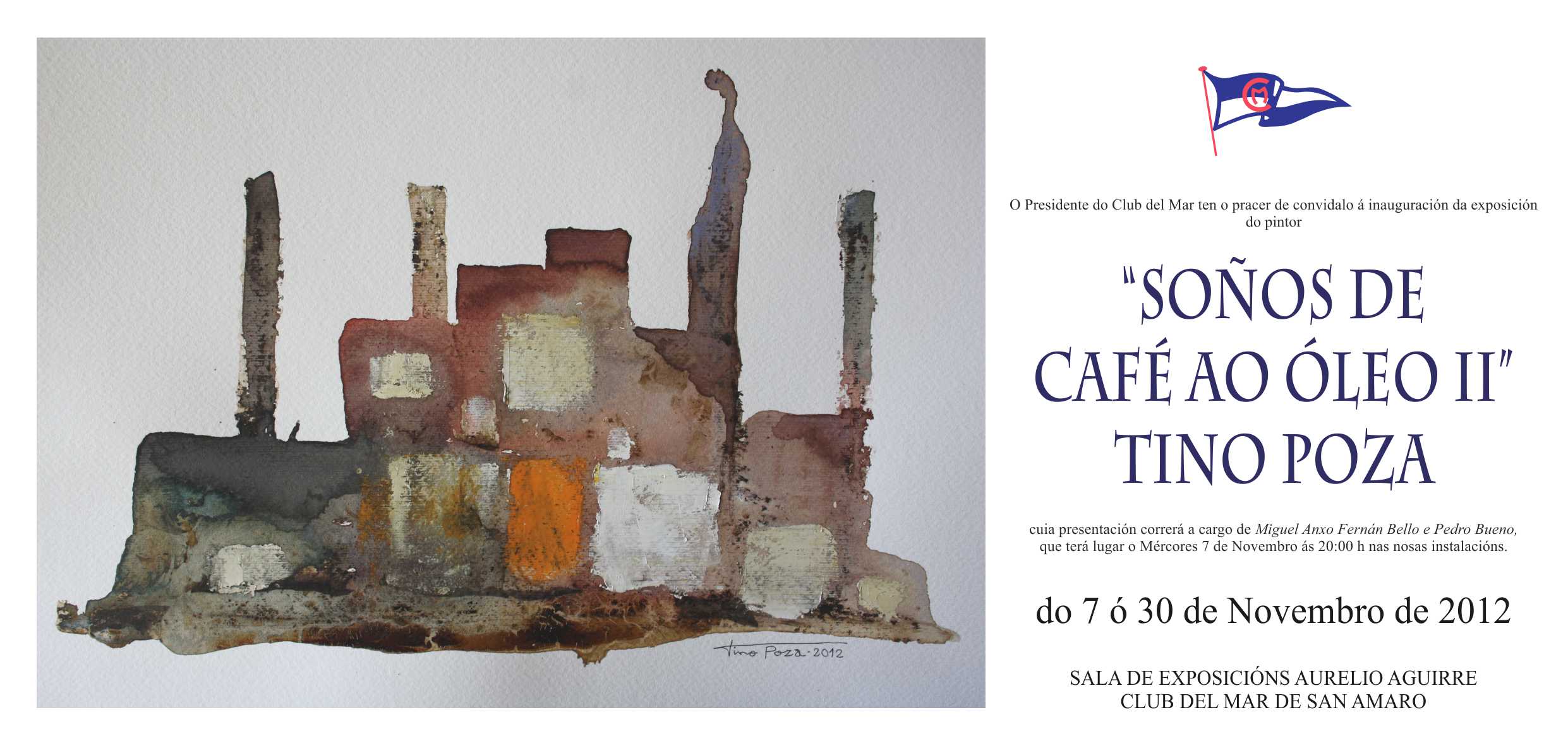 Tino Poza inaugurará una nueva exposición titulada «Soños de café ao óleo II» que se inaugurará mañana día 7 en el Club del mar de San Amaro. La muestra estará abierta al público hasta el 30 de noviembre en la sala «Aurelio Aguirre». Desde estas líneas deseo a Celestino Poza el mayor éxito.
