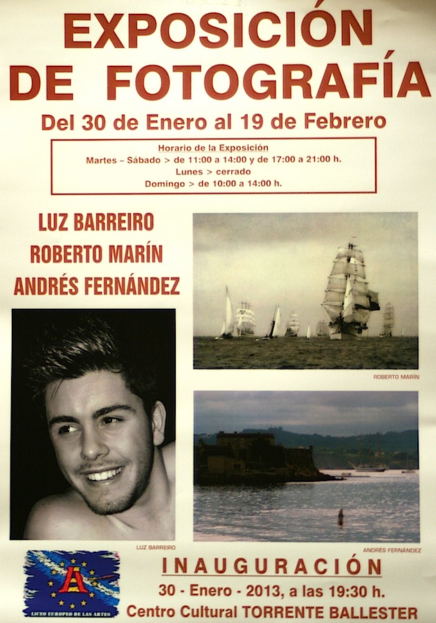 Desde hoy miércoles día 30 de enero hasta el 19 de febrero en el Centro Cultural Torrente Ballester de Ferrol se puede ver una exposición fotográfica de Luz Barreiro, Roberto Marín y Andrés Fernández. Los horarios de visita son de martes a sábado de 11 a 14 y de 17 a 21 horas. Los domingos de 1o a 14 horas. (Ojo… lunes cerrado).