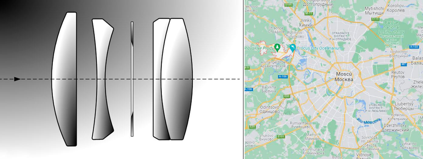 A la izquierda la disposición de elementos en un objetivo del tipo Tessar. A la derecha la localización (punto verde) de la fábrica KMZ en las periferia de la telaraña de Moscú.