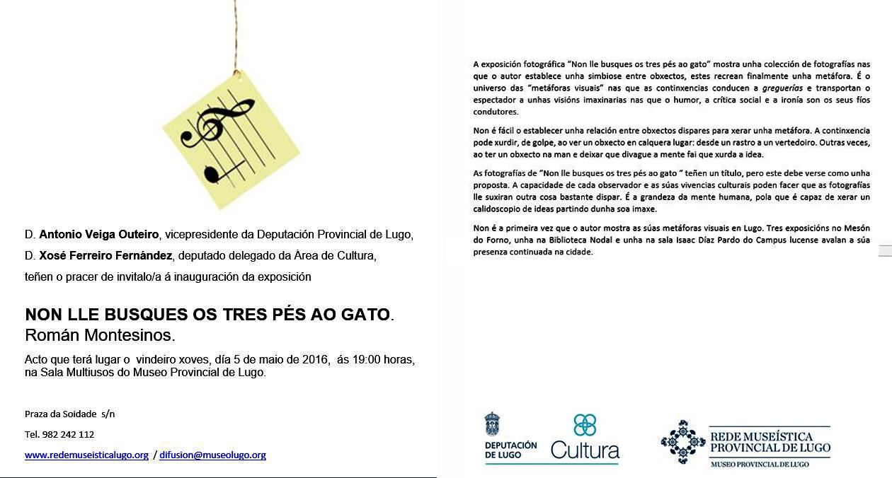 El próximo jueves día 5 a las 19 horas inauguro una exposición en el Museo Provincial de Lugo. Presidirá el acto el Delegado de Cultura de la Diputación de Lugo Xosé Ferreiro y seré presentado por el genial artista Paco Pestana.