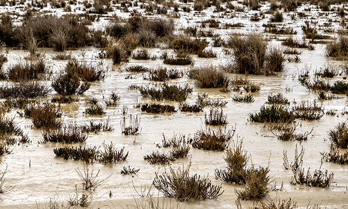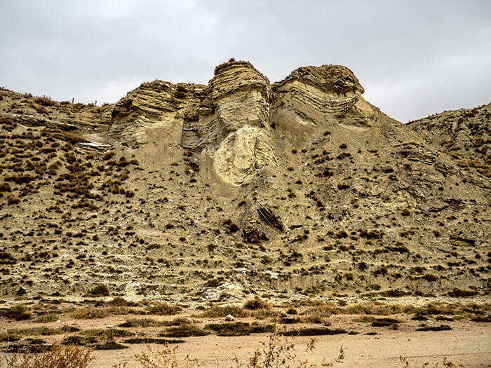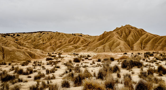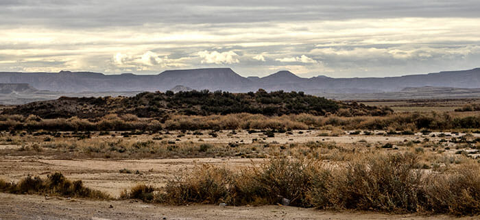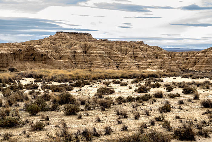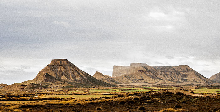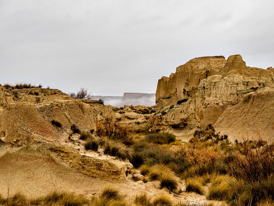 Uno de los parajes del norte de la península más espectaculares que conozco es el de las Bardenas Reales. Las Bardenas son un “semidesierto” situado en el extremo sureste de la comunidad foral de Navarra. Se caracterizan por su clima muy seco de carácter continental con temperaturas muy altas en verano y muy frias en invierno. Las clasificaciones son engañosas a la par que subjetivas: el que se denomine semidesierto a las Bardenas está en función de varias variables, entre ellas, el índice de precipitaciones anuales. Llover llueve, de eso doy fé, ya que en esta ocasión que las visité de nuevo llovía bastante (finales de diciembre de 2017), pero la naturaleza peculiar del suelo y las rocas (arcillas, yesos y, en menor medida, areniscas) condicionan la absorción del agua en el terreno. Tenemos entonces un secarral, mayormente arcilloso, con escasa vegetación de tipo matorral que sobrevive a duras penas. Un desierto amarillento-rojizo que me recuerda algunas zonas del Atlas marroquí.