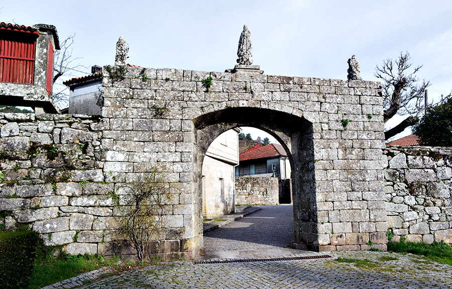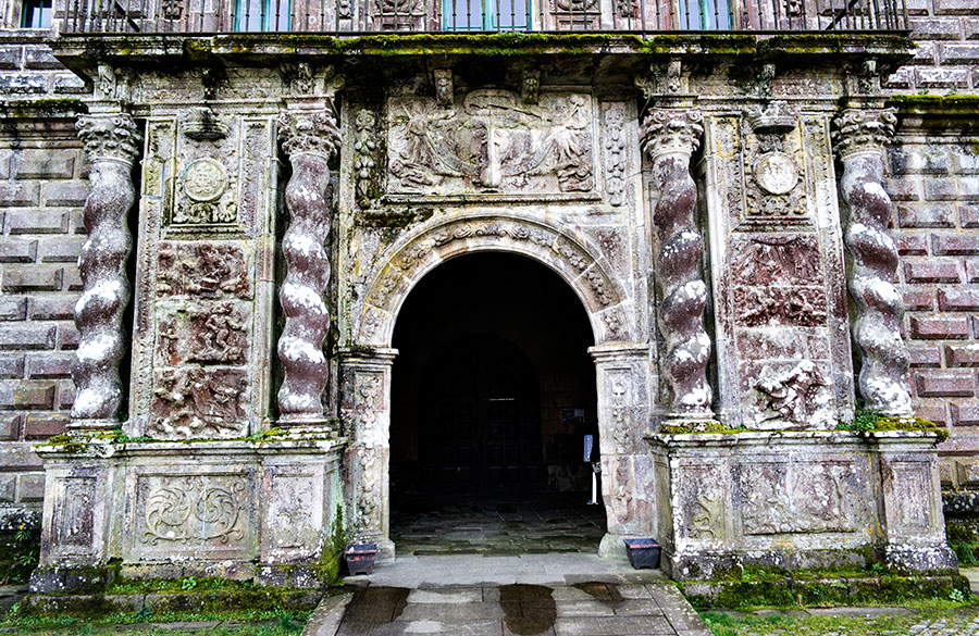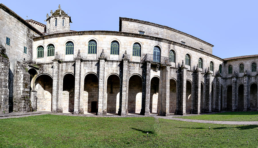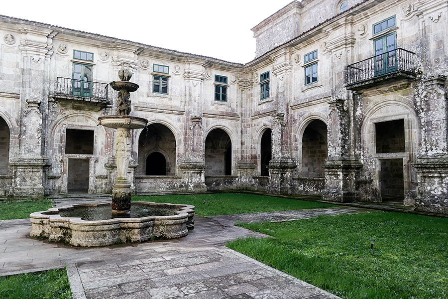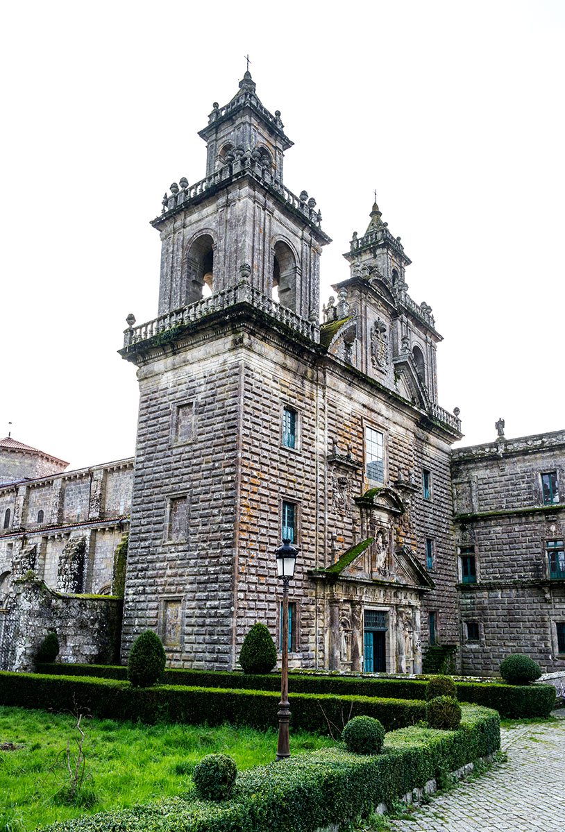 La fachada del monasterio, inmediata a la iglesia, es original de Francisco Castro y Canseco. Construida en el siglo XVIII forma parte del barroco compostelano. Ornada profusamente destacan sus cuatro columnas salomónicas y medallones.