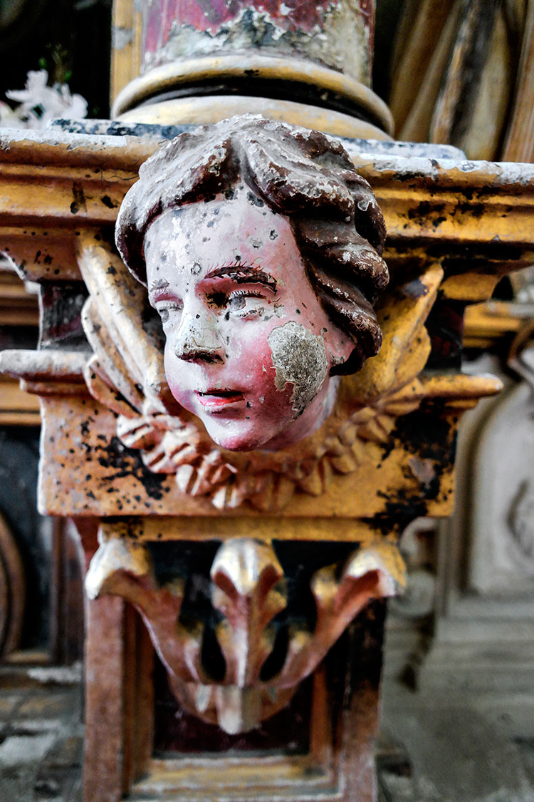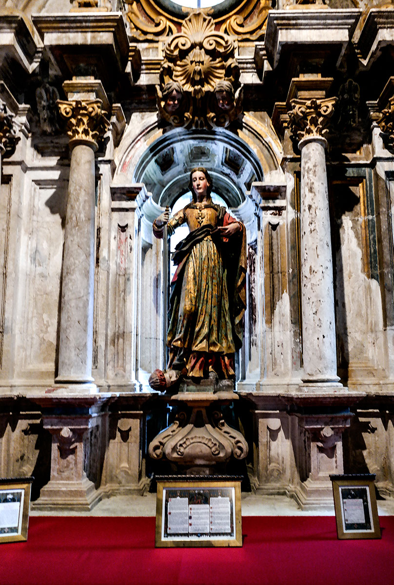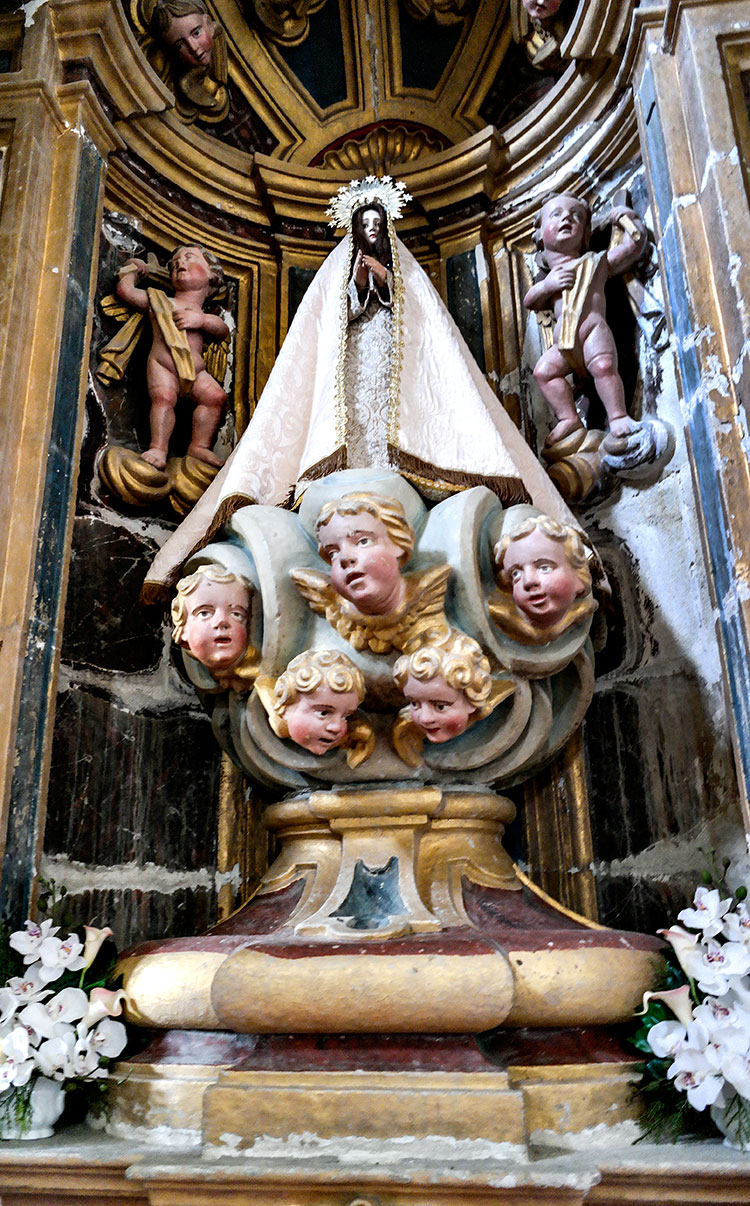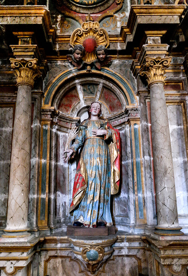 Existen numerosos retablos barrocos en la iglesia pero los que más me llamaron la atención son los que se localizan en la girola. La ornamentación es profusa y las tallas, incluidas las de las imágenes, son exquisitas. La maestría de sus autores llega a un punto máximo tal que absolutamente todos los elementos de esos retablos están tallados y policromados en granito; por ejemplo, los retablos y las imágenes de santa Victoria y santa Catalina de Alejandría (las dos fotos inmediatas). Ángeles, columnas, capiteles, etc. son de granito.