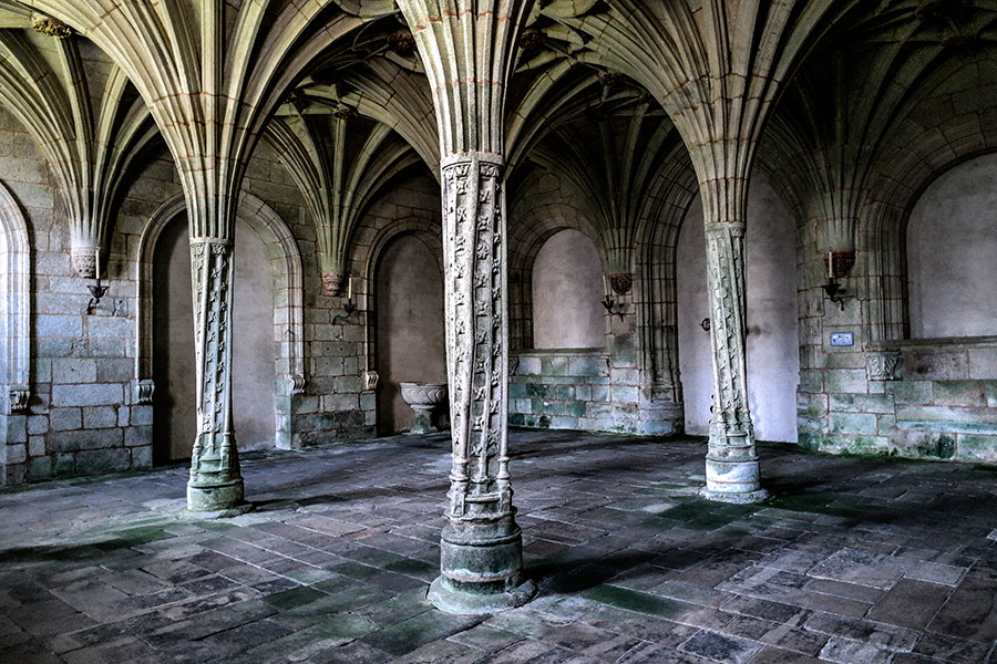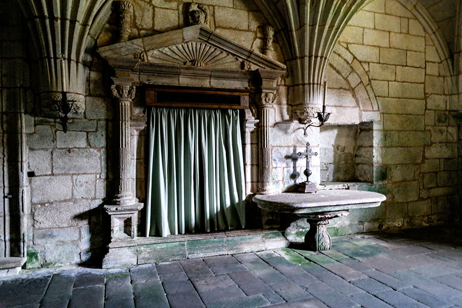 Es magnífica. De planta cuadrada el espacio se divide por cuatro columnas torsionadas con giros dextrógiros y levógiros. Tiene su origen en los finales del siglo XV o principios del XVI. La bóveda, de crucería, está profusamente decorada con rostros que no tienen otra finalidad que la simple decoración. Los nervios de la bóveda son curvos con multitud de nervaduras que forman trazados singulares y muy bellos. Una joya.