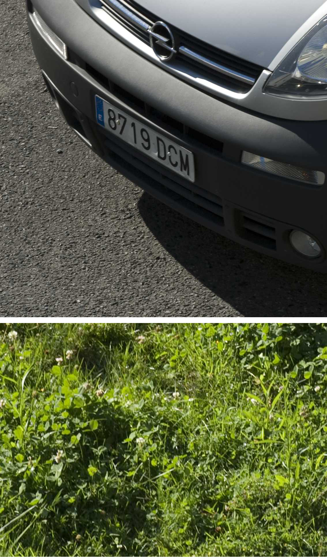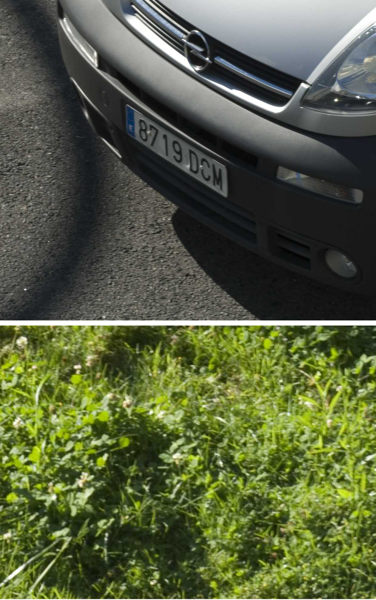 Las dos fotos de la matrícula del coche están obtenidas a 1/250″ f:8. Más espectacular es la segunda serie de fotos, las de la hierba. Están hechas a más distancia y se observa que el comportamiento general de la óptica es muy bueno, teniendo en cuenta que la velocidad de disparo que, en este caso, es de 1/100″ a f:8 y que la prueba es sin trípode. No olvidemos que no hay nada de máscara de enfoque.