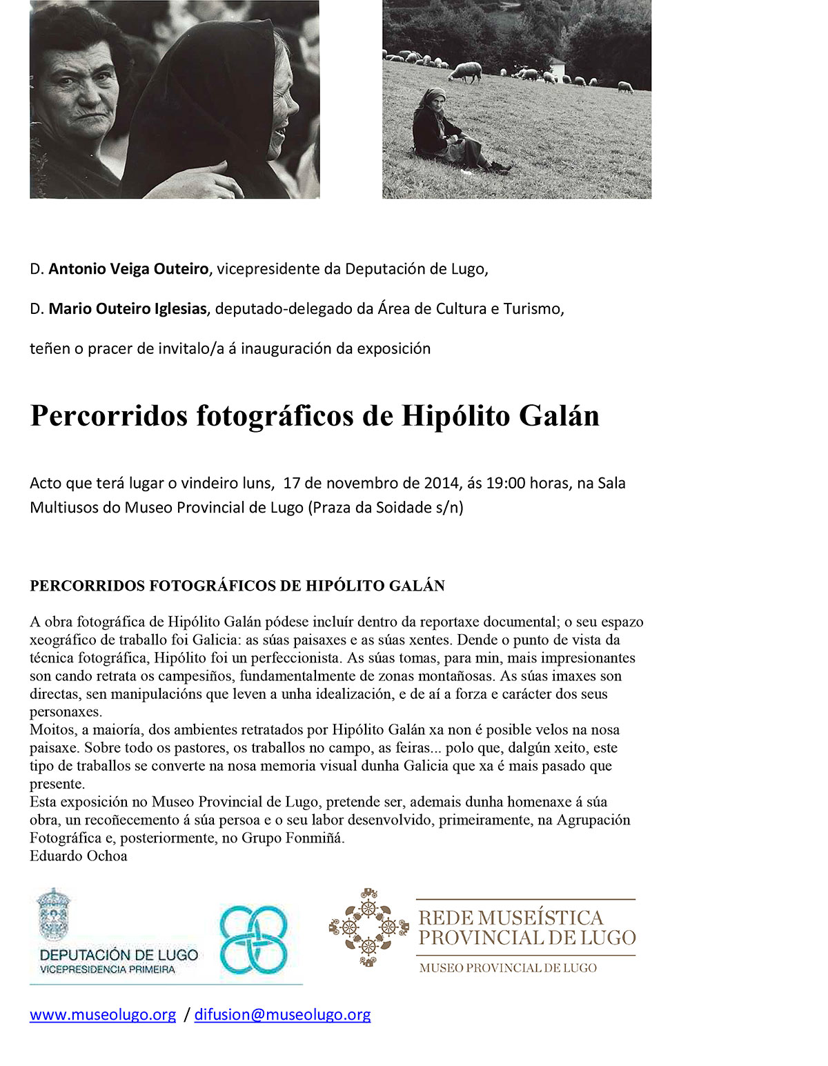 En honor y recuerdo de Hipólito Galán el Museo Provincial de Lugo inaugura el próximo lunes 17 de noviembre a las 19 horas una muestra de la obra de este fotógrafo. La visita de la exposición es obligada para aquellos que quieran conocer, a través de imágenes, la Galicia rural y la sociedad lucense de mediados del siglo XX.