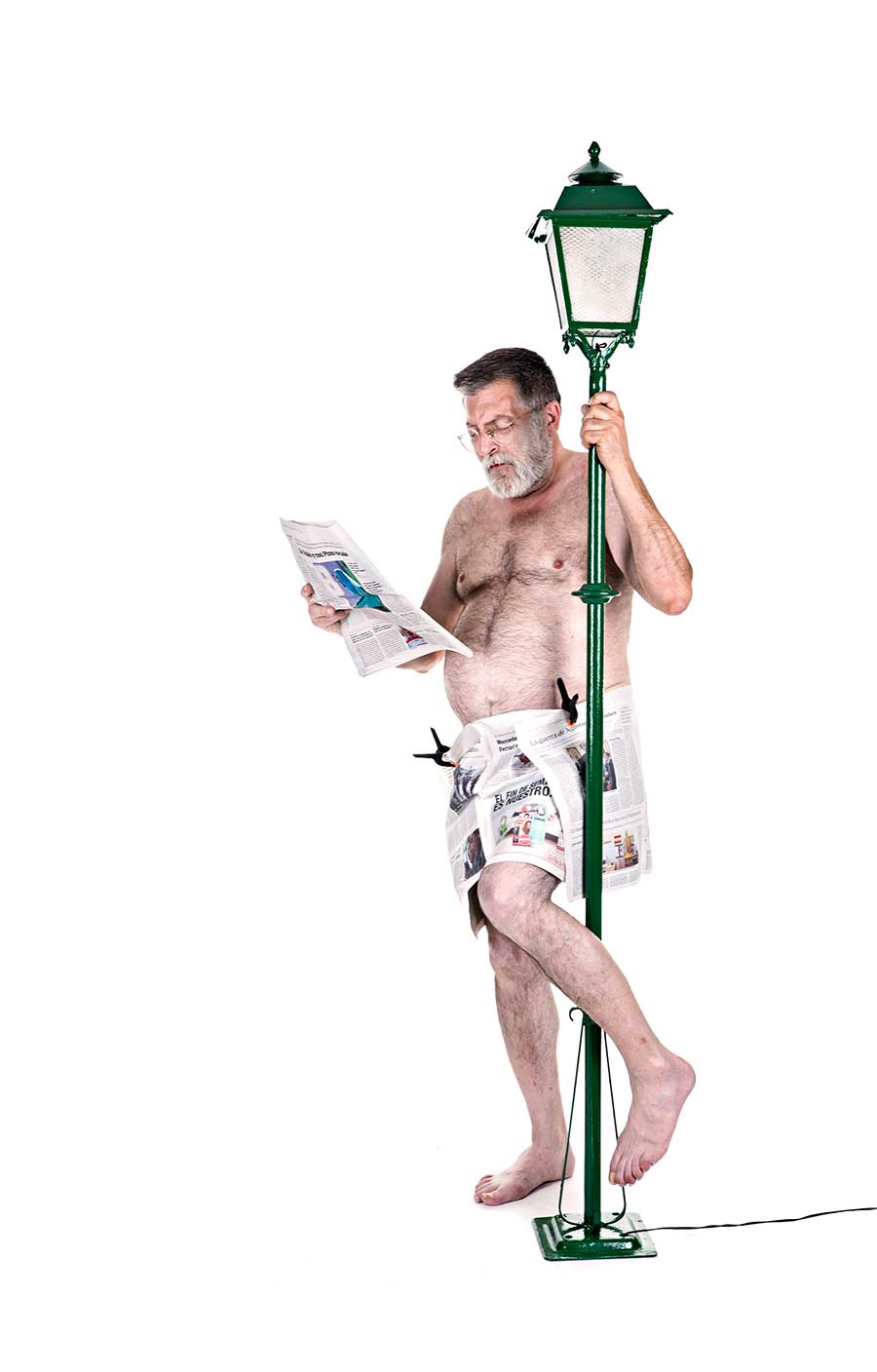 Dice en El Quijote que «desnudo nací, desnudo me hallo; ni pierdo ni gano«. Así mi amigo Cristóbal, periodista de larguísima trayectoria, posó dulcemente para mi bajo la luz de una farola. Su currículum es largo, fue director de periódico, subdirector, jefe de gabinete de prensa, etc. etc. Procuro no decir al interfecto que pongo delante de la cámara el qué y el cómo le voy a hacer la foto. Prefiero que sea una sorpresa. Ni qué decir tiene que la de mi amigo ha sido morrocotuda.