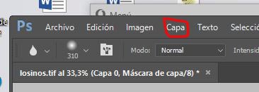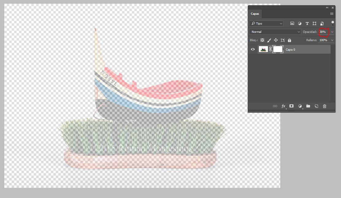 Abajo, en el cuadro de capas hay una función que es «crear máscara de capa» (está señalada en rojo en la foto de arriba). Creamos la máscara y nos vamos, en el mismo cuadro de diálogo, a «opacidad». Ajustamos el valor de la opacidad y vemos que la imagen se desvanece.