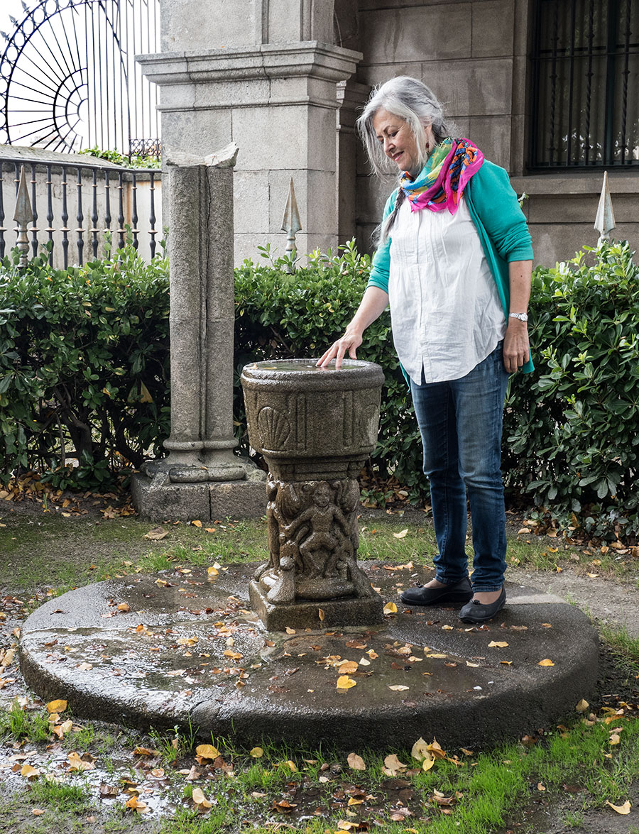 En la foto Rosa Guisán posa junto a la bella y bucólica fuente del jardín de San Carlos (La Coruña). El proyecto no va de fuentes ni de columnas como las de la foto, pero no es momento de desvelarlo. En su día habrá un axposción con los resultados… pero eso, como en la película, es otra historia.