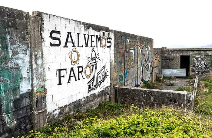 Parece una situación planteada por Groucho Marx. Cuando vi el faro de Lariño, abandonado él, y la pintada en un muro que ponía «Salvemos o Faro» mis ojos no daban crédito. Un faro es para salvar vidas, no para que lo salvemos a él. Un bonito faro que, seguro, sirvió de guía a los marineros, les dió esperanza y les salvó en alguna situación, sufre un ignominioso corredor de la muerte. Ya lo sabemos, en este país se abandona el patrimonio, se deja que se hunda y, luego, si se le cruza el cable a alguna administración, se reconstruye a partir de sus ruinas.