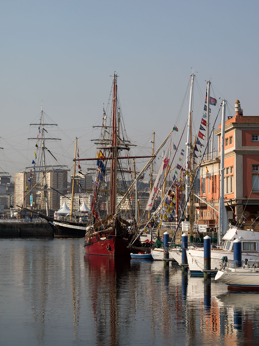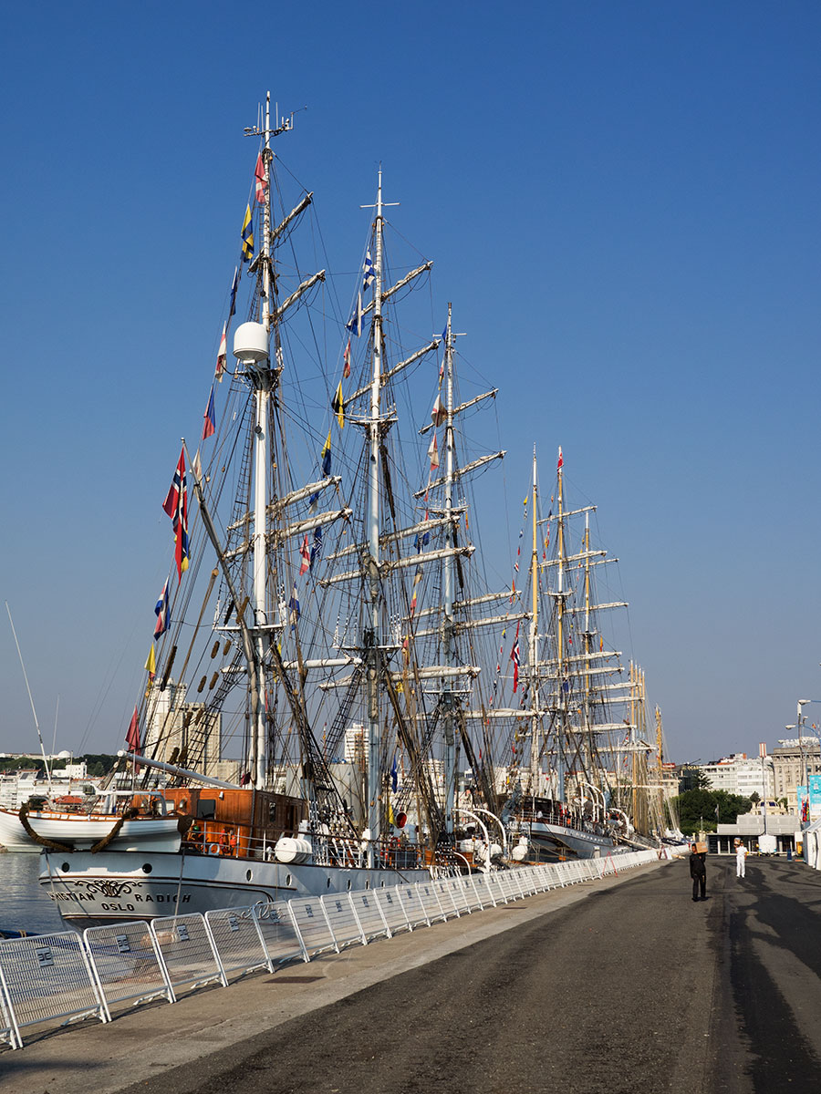 Por su parte, uno de los barcos más antiguos de los que visitan A Coruña estos días es el Statsraad Lehmkuhl, un barco noruego construido en 1914. Su eslora es de 97,21 metros y puede llevar hasta 180 personas. Además, la persona más anciana de todas las tripulaciones viaja en este barco, un americano de 83 años llamado Richard Gleen, de Illinois. Tiene además un estilo arquitectónico único en el mundo.