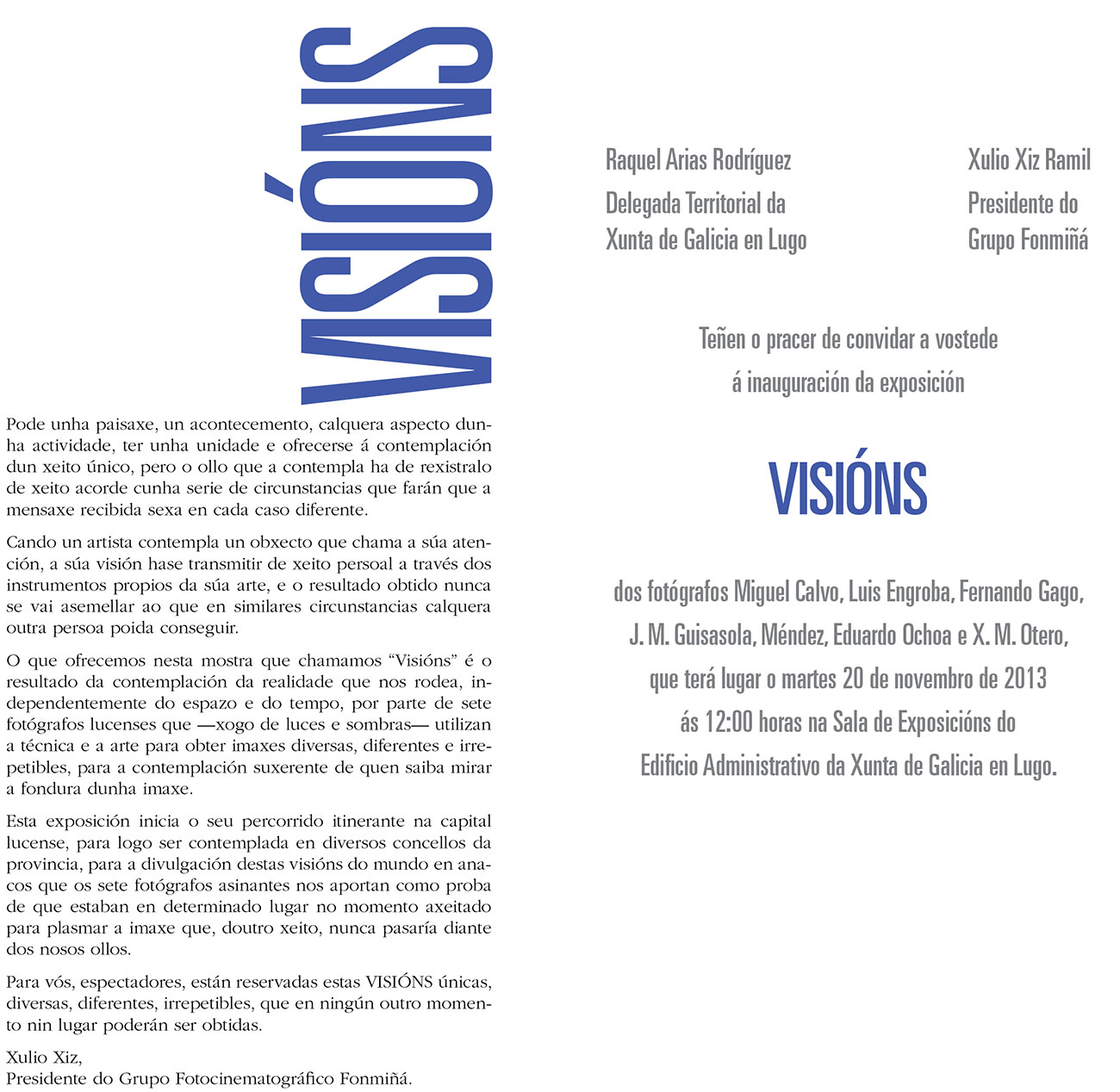 El día 20 de noviembre a las 12 horas y en la sala de exposiciones del edificio administrativo de la Xunta de Galicia en Lugo se inaugura una exposición titulada «Visións». Los fotógrafos que reunen sus obras son Miguel Calvo, Luis Engroba, Fernando Gago, J. M. Guisasola, Méndez, Eduardo Ochoa y X. M. Otero. Mi enhorabuena a todos ellos.