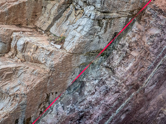El límite K/T en Zumaia, País Vasco. La línea roja marca la posición de la capa de arcillas (unos 2 ó 3 centímetros de espesor) y, por tanto, la posición del límite K/T. Esa capa es un cronohorizonte; es decir, tiene exactamente la mima edad en todos los puntos de la Tierra donde aparece.