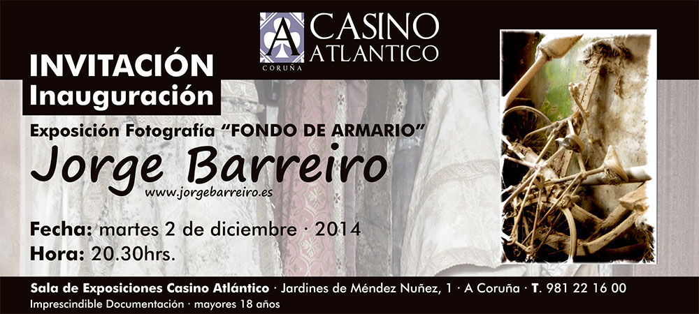 El martes 2 de diciembre se inaugura, a las 20,30 horas, la exposición fotográfica de Jorge Barreiro titulada «Fondo de armario» en la nueva sala del Casino Atlántico de La Coruña. El Casino Atlántico está situado en los jardines de Méndez Núñez en pleno corazón de la ciudad herculina. Más información en http://www.jorgebarreiro.es